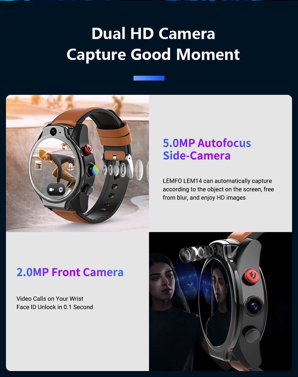 LEMFO LEM14 Smart Watch 4G 5ATM Waterproof Android 10 Helio P22 Chip 4G 64GB Face ID Dual Camera