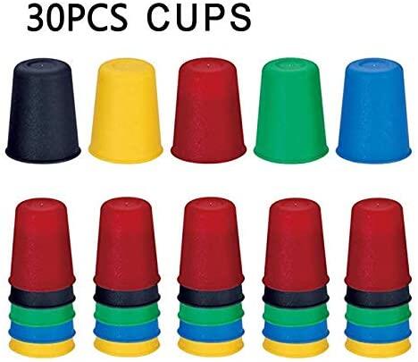 30 mini cups in 5 colors(green,red,blue,black and yellow),each color 6 cups.Small version cups that make this game more fun for training your reactivity and develops hand-eye coordination.