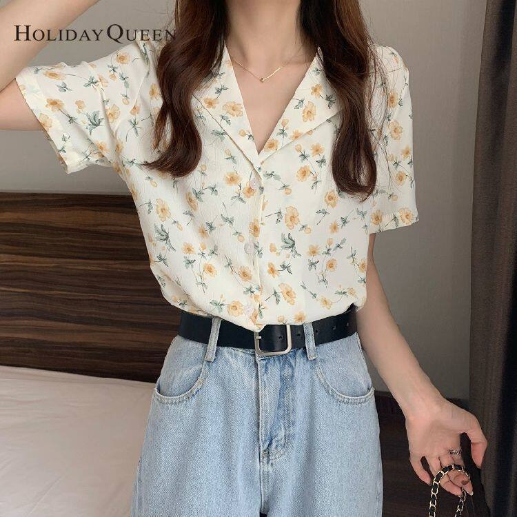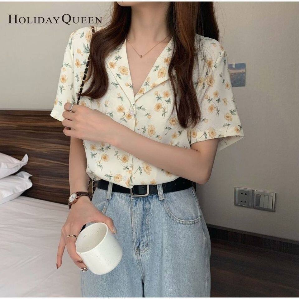 HolidayQueen Top Women's New Loose Small Fresh Floral Shirt Retro Wild Shirt Short-sleeved Design Niche HQP0900