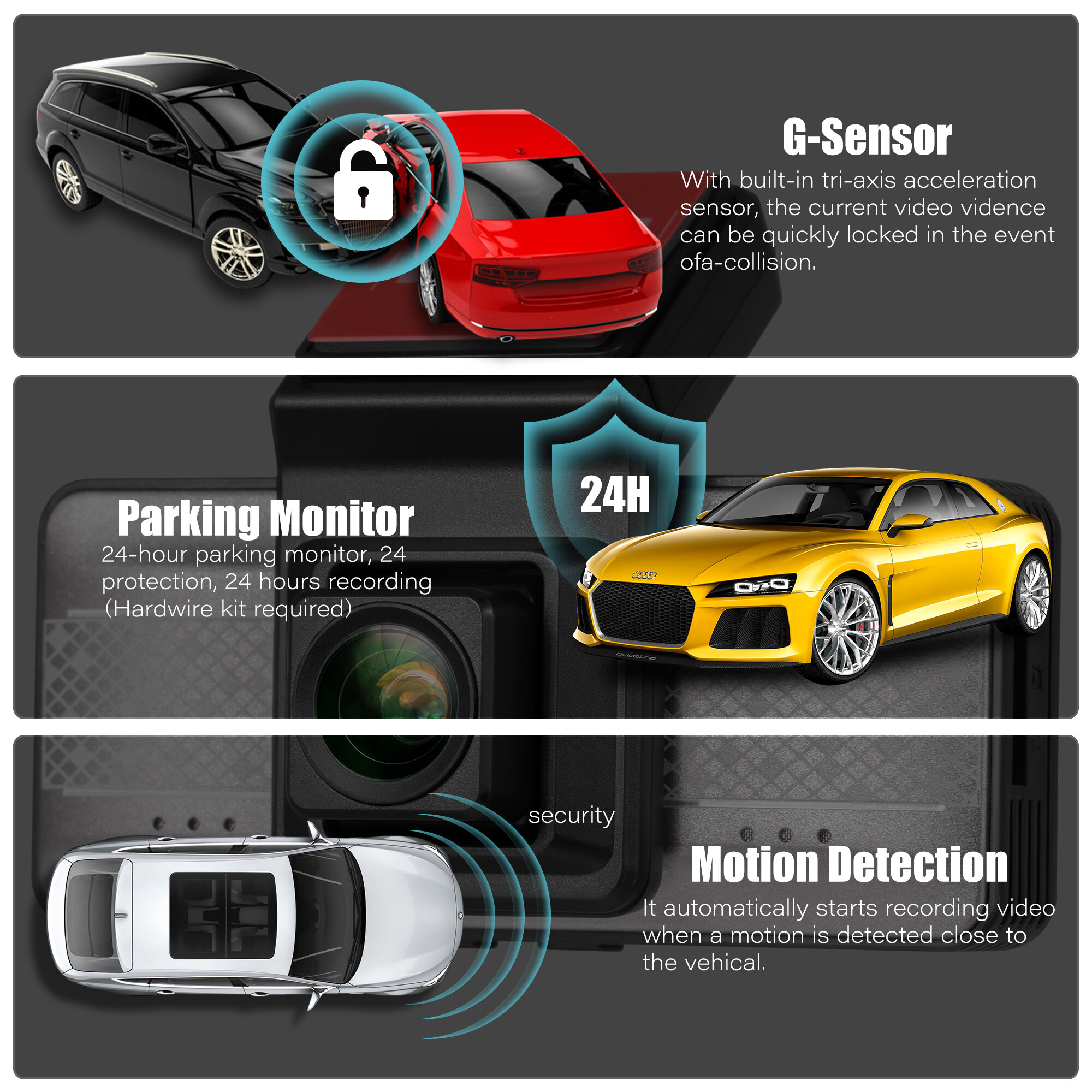 With built-in tri-axis acceleration sensor, the current video vidence can be quickly locked in the event ofa-collision.