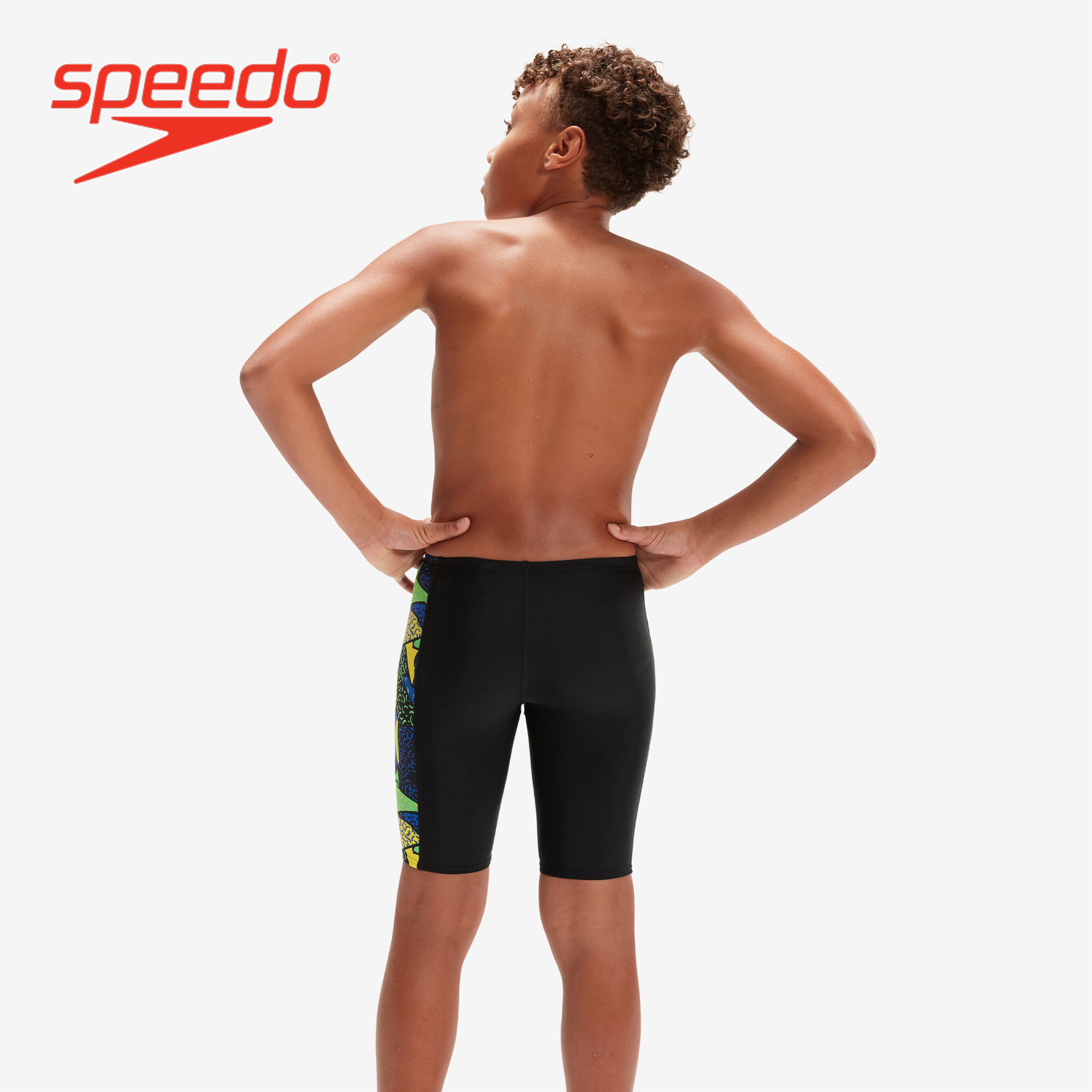 Style and comfort for lessons and training. Ooze confidence wearing this sleek black Jammer, which features side panels of our high-energy abstract print in bright yellow, green and blue. Lined at the front for comfort and modesty, the jammer includes an internal drawcord to allow your child to achieve a secure and comfortable fit. Providing higher chlorine resistance than standard swimwear fabrics, it offers excellent shape retention and fits like new for longer with CREORA® HighClo. If you’re looking for great eco-credentials, it’s got those, too: our exclusive Eco EnduraFlex fabric is made from 100% recycled pre-consumer waste, such as fabric waste from factories.