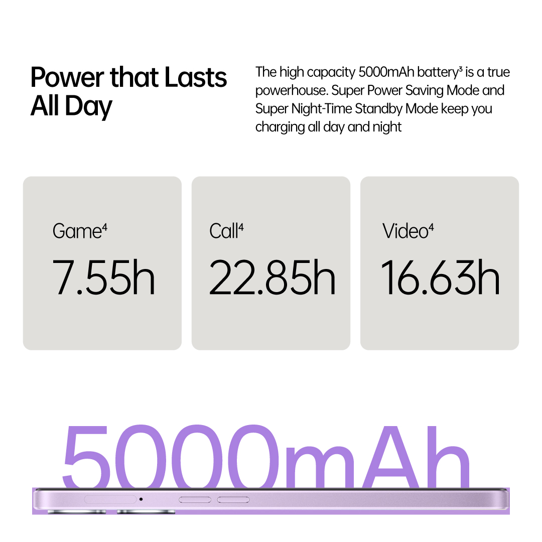 Never worry about running out of power with 33W SUPERVOOC™¹. Complete battery protection makes charging your phone safer than ever. The high capacity 5000mAh battery³ is a true powerhouse. Super Power Saving Mode and Super Night-time Standby Mode keep you charged all day and night.